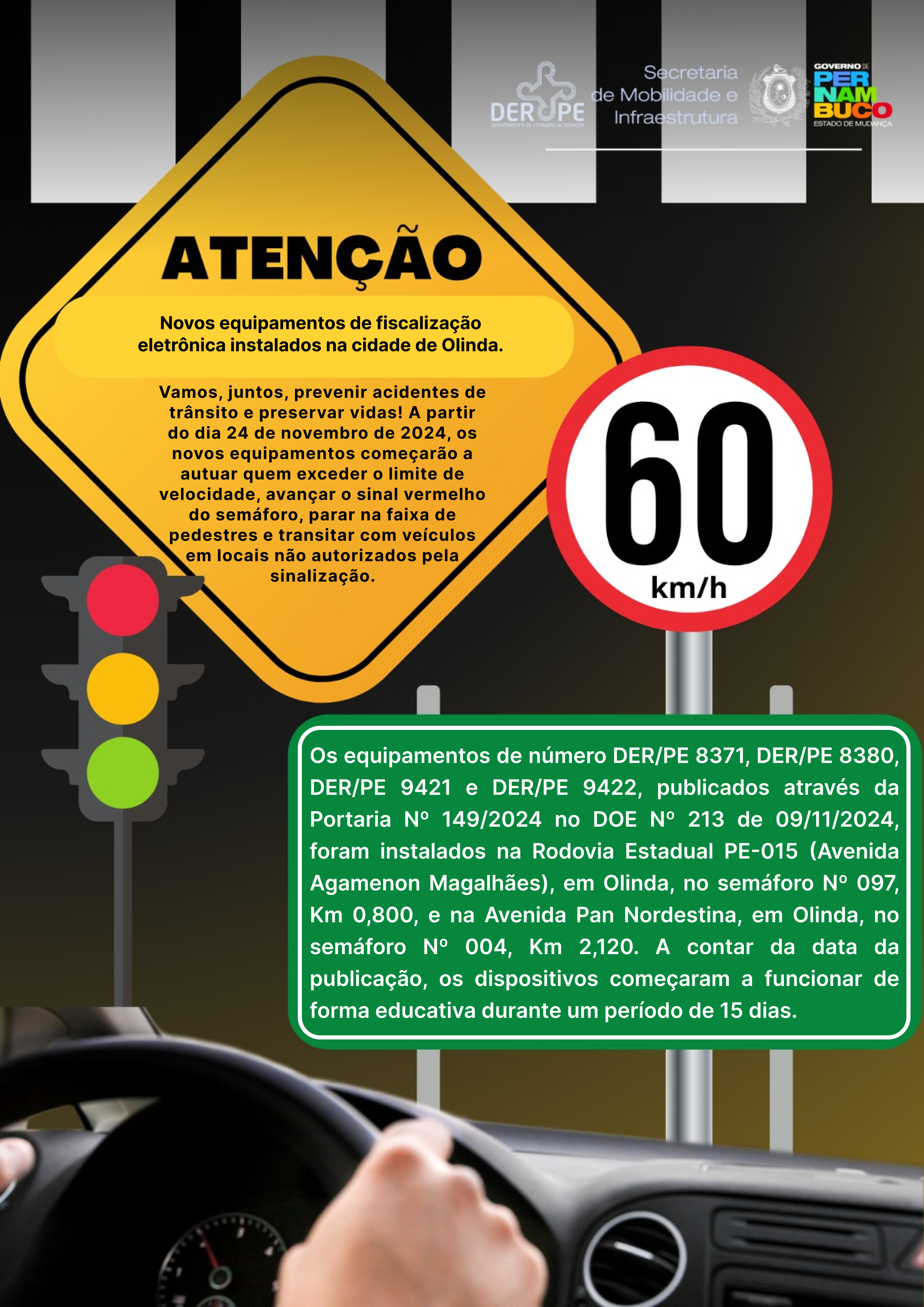Vamos, juntos, prevenir acidentes de trânsito e preservar vidas! A partir do dia 24 de novembro de 2024, os novos equipamentos começarão a autuar quem exceder o limite de velocidade, avançar o sinal vermelho do semáforo, parar na faixa de ped...