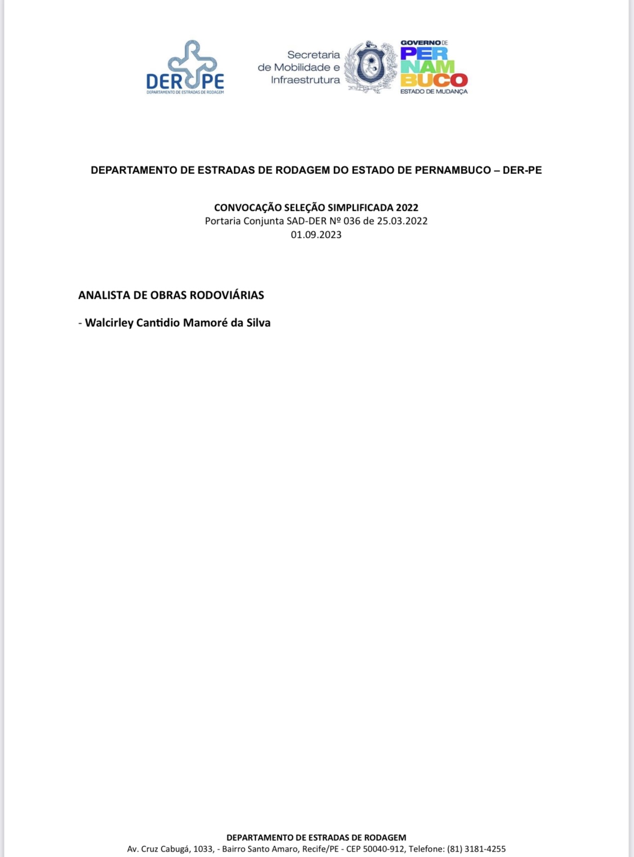 Nesta sexta-feira (01.09.2023), o Departamento de Estradas de Rodagem do Estado de Pernambuco – DER-PE convoca o aprovado dentro das vagas de concorrência geral, listado em anexo, previstas no Edital da Seleção Simplificada 2022 (Porta...