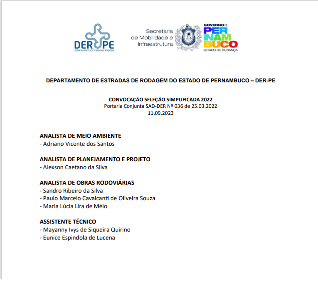 Nesta segunda-feira (11.09.2023), o Departamento de Estradas de Rodagem do Estado de Pernambuco – DER-PE convoca os aprovados dentro das vagas de concorrência geral, listados em anexo, previstas no Edital da Seleção Simplificada 2022 (Portari...