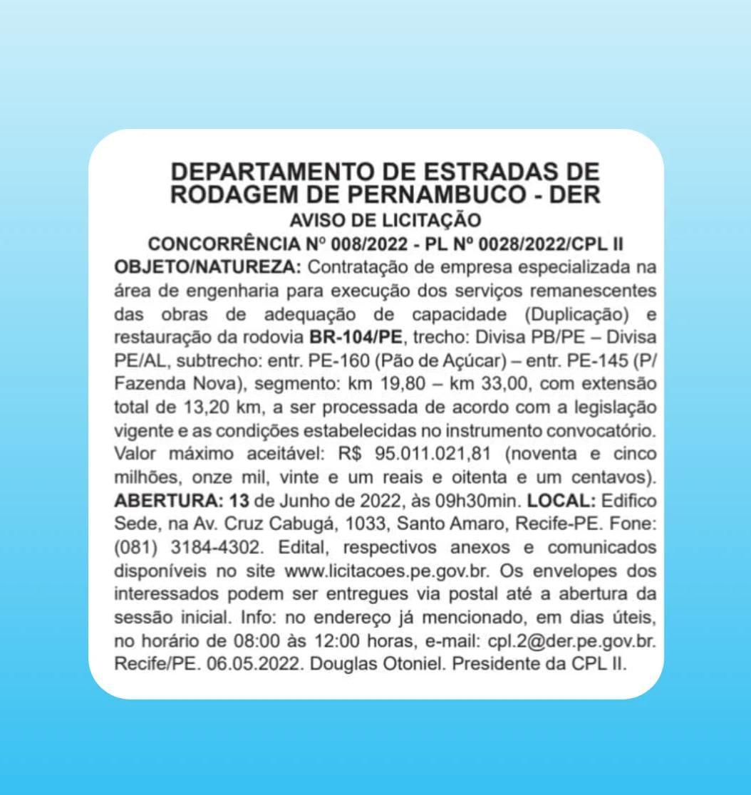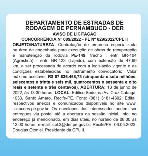 Mais um avanço importante para a reestruturação da infraestrutura rodoviária no Estado. O Governo de Pernambuco publicou no Diário Oficial do Estado deste sábado (07), o edital para contratação da empresa responsável pela retoma...
