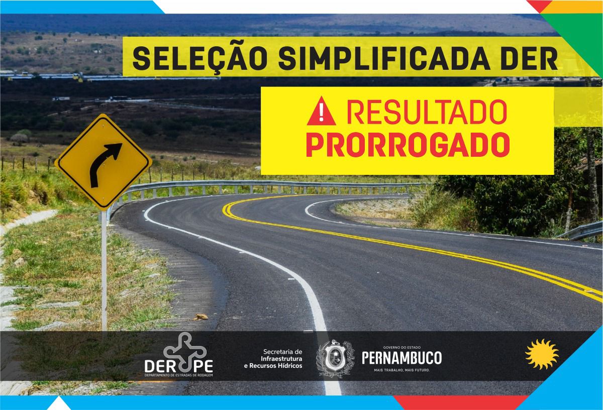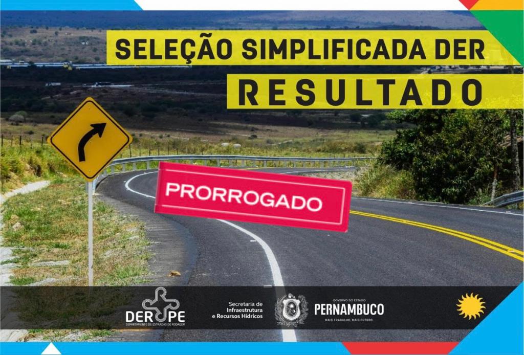 O Departamento de Estradas de Rodagem (DER) informa que fará nova prorrogação da divulgação do resultado da seleção pública simplificada. A data da comunicação deste resultado foi postergada para o dia 13, sexta-feira, até às 23h59.Imp...