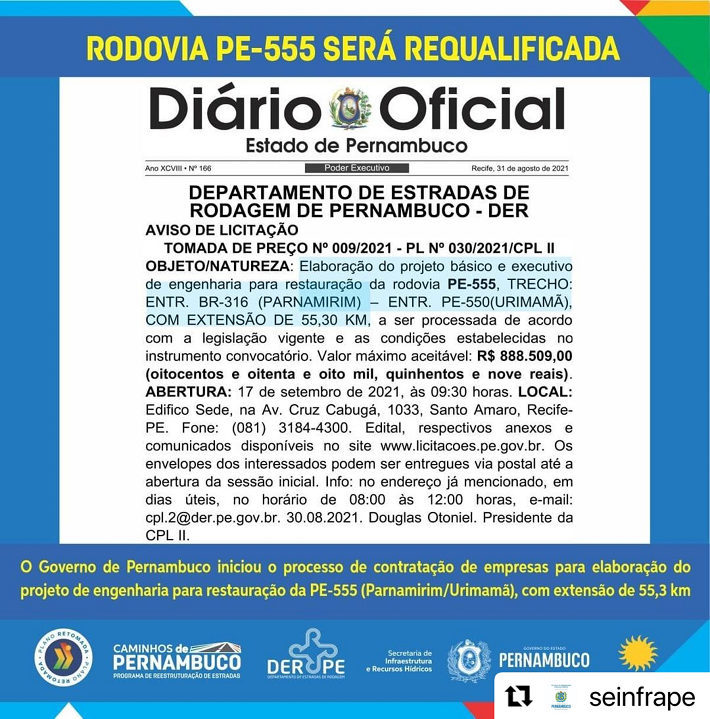 Saiu no Diário Oficial da terça-feira (31/08), o edital para contratação do projeto de engenharia para requalificação da PE-555, entre Parnamirim e Urimamã, com cerca de 55 quilômetros. A iniciativa foi autorizada pelo governador Paulo C...