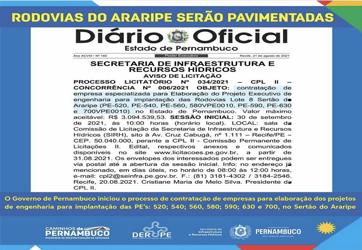O Governo de Pernambuco publicou no Diário Oficial de sábado, 21 de agosto de 2021, o edital para contratação de empresa especializada para elaboração dos projetos executivos de engenharia para implantação de sete rodovias no Ser...