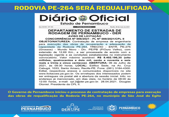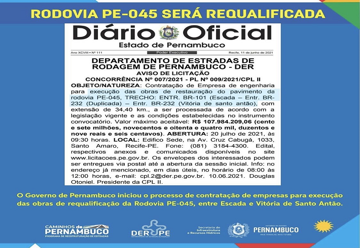 Governo de Pernambuco anunciou a contratação para a reconstrução de mais uma rodovia estratégica. Na sexta-feira (11), foi publicado no Diário Oficial do Estado o edital para contratação da empresa de engenharia para execução das obras...